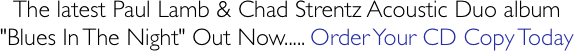 Welcome to all Blues lovers out thereā¦..Brand New Paul Lamb & Chad Strentz Acoustic Duo Album.....Out Now.....